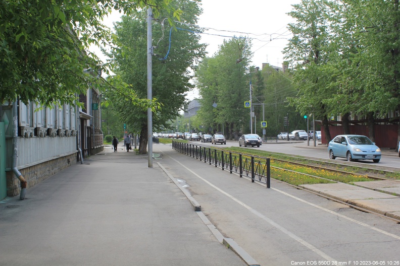 Трамвай № 165 у здания Пенсионного фонда двигается по улице Декабрьских Событий в сторону танка